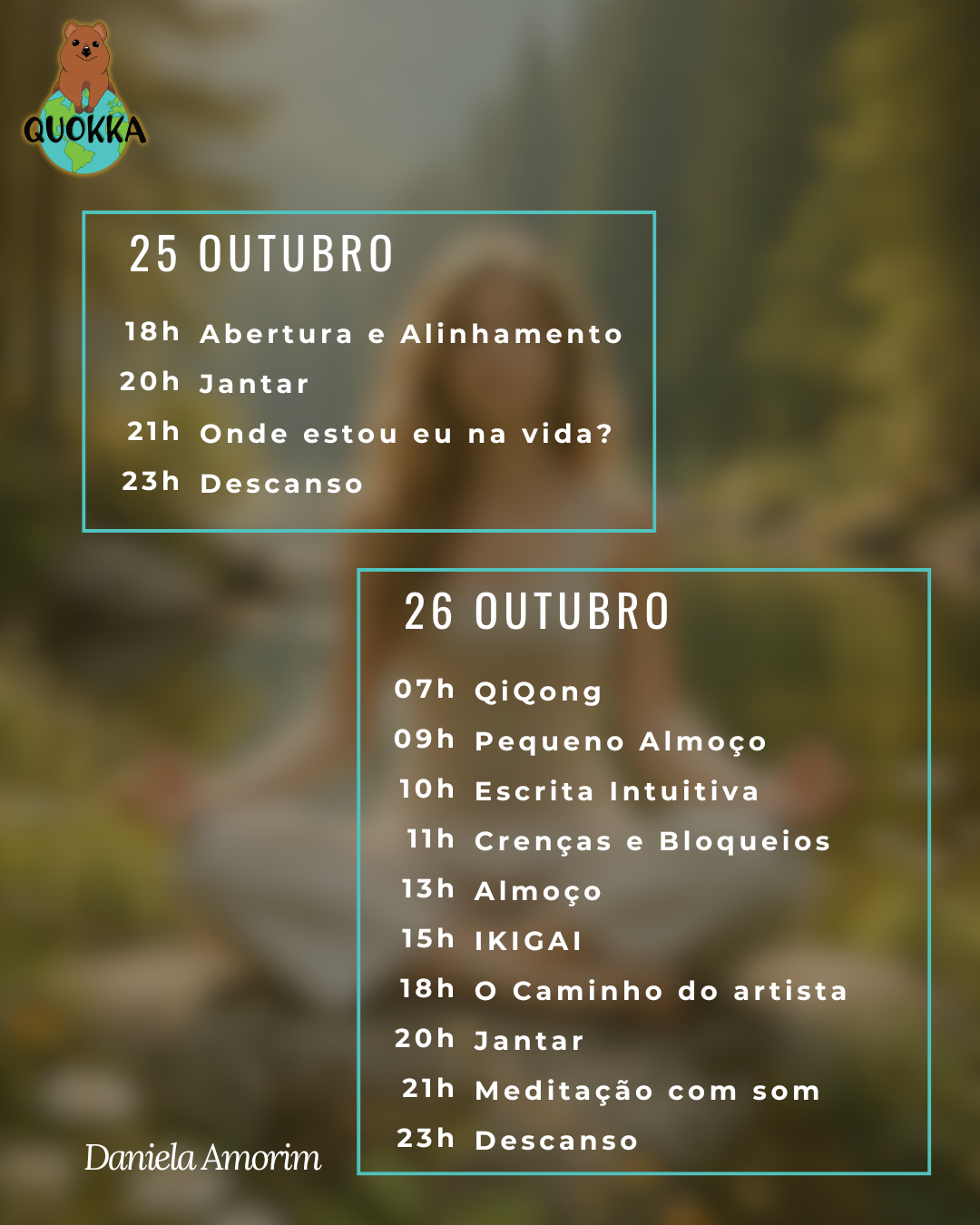 - Daniela Amorim é Escritora e Guia de Desenvolvimento Pessoal. Tem uma ligação profunda ao planeta Terra, é uma apaixonada pela empatia e pratica ativamente a sua mediunidade, o que a leva a criar ferramentas de desenvolvimento pessoal únicas. Acredita que o equilíbrio pessoal é a essência da vida e o segredo para gerar empatia por todas as formas de vida. Com toda a sua aprendizagem ao redor do mundo e da sua experiência propõe-se guiar-te na tua jornada de auto-descoberta e expansão, com diversas técnicas de desenvolvimento pessoal para te levar a veres o teu propósito pessoal. É ainda autora de livros de desenvolvimento pessoal, o Sustentável(mente), e do Oráculo da Serra d'Arga. Viveu mais de um mês num templo na China e tem uma ferramenta de produtividade importante para partilhar contigo. Conhece-a no instagram em @danielajsamorim