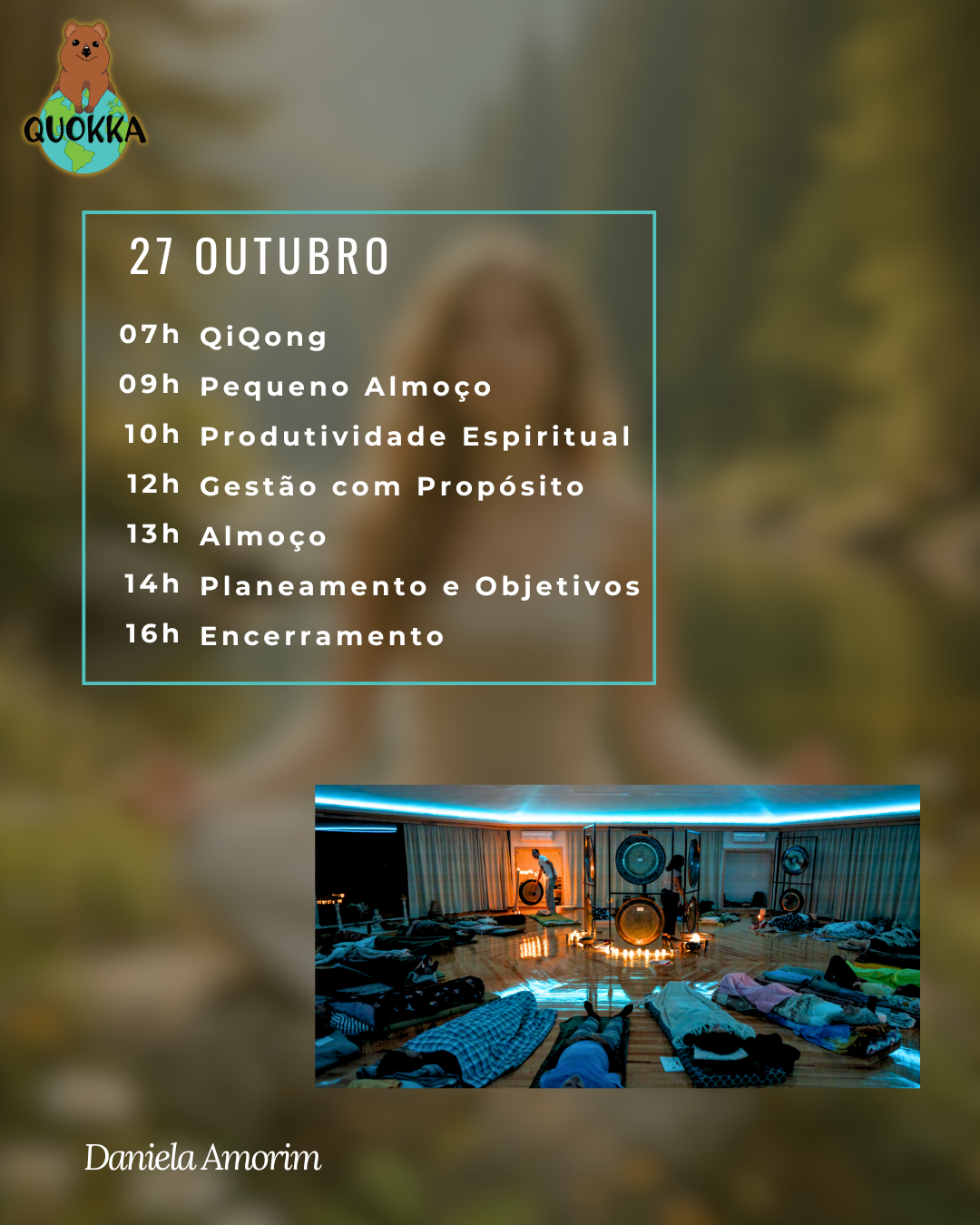 Vamos usar técnicas de desenvolvimento pessoal e bem estar como IKIGAI, meditação com gongos planetários, exercícios sistémicas e práticas de bem estar chinesas, tudo junto para formular o teu caminho do sucesso com produtividade espiritual, aprendido na primeira pessoa pela Daniela ao redor do mundo.